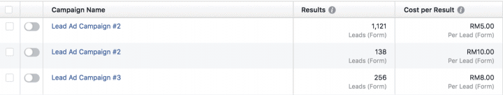 You can think of it as the Facebook version of Google Forms. The key difference here is because the lead ad is an inherent product of Facebook, you are able to track, down to the ad level, which specific campaigns are driving the best results for you. You don’t need to implement a tracking code on the “Thank-You” page of the Lead ad as it is done automatically for you. Here’s how it might look on your Facebook Ads Manager Dashboard: