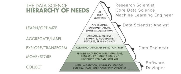 As you noticed, at the bottom of the pyramid we have collecting, storing and transforming. These three data science needs fall into the roles of a data engineers and software developers.
