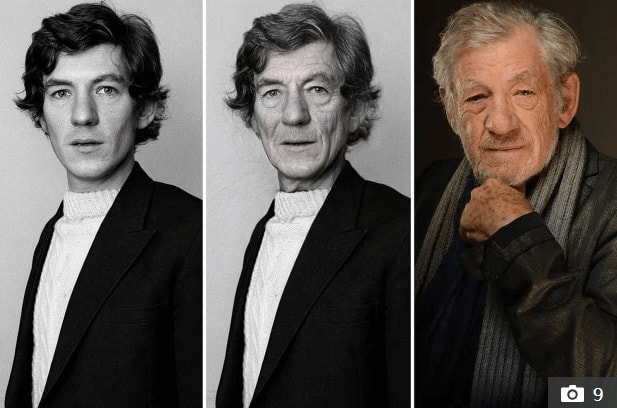 The Sun plugged an image of a young Sir Ian Mckellen (left) into FaceApp to make him look older (centre image). They then compared FaceApp’s effort with a photo of him today (right). Faceapp managed to predict Sir Ian McKellen’s sunken eyes, hair and wrinkles, striking a close resemblance to his current photo today!